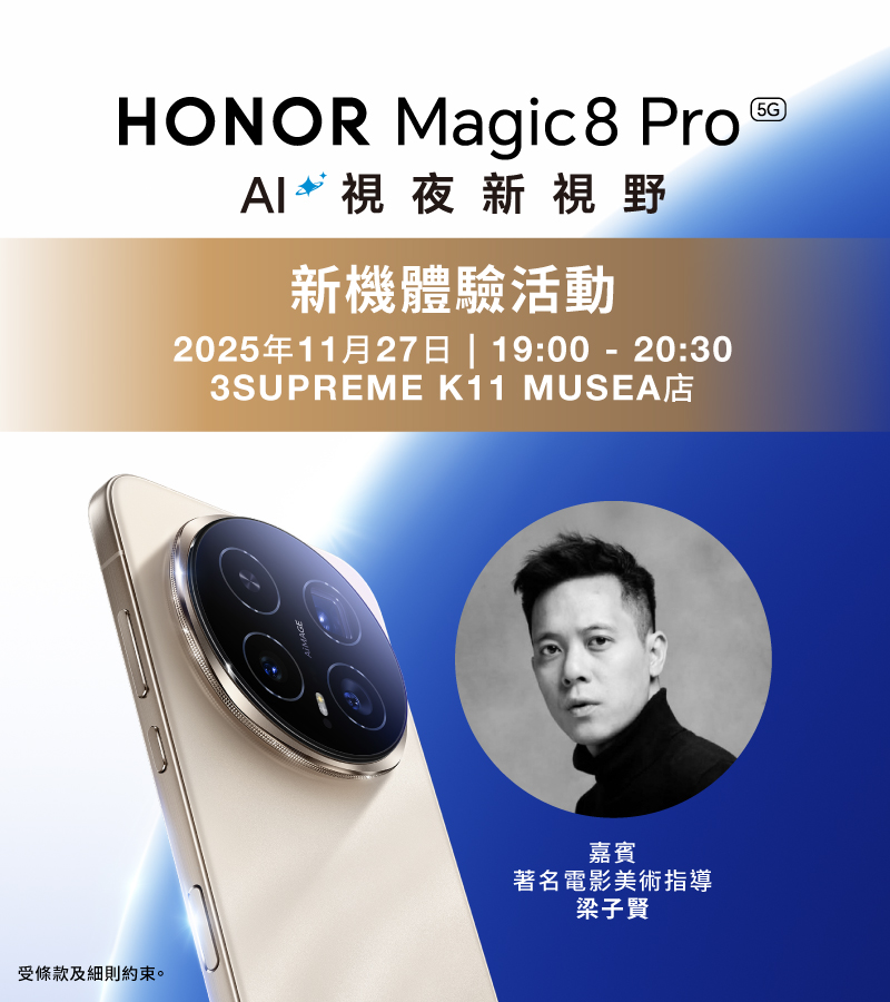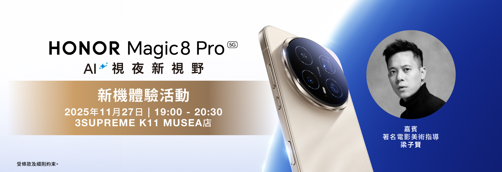 HONOR Magic8 Pro擁有「AI超夜神」魔法,將會於11月26日閃耀登場!新機搭載2億像素AI 超級長焦鏡頭,即使在光線複雜的夜景下,也能清晰捕捉城市燈火或野外星空的豐富細節。 3SUPREME 誠邀你參與優先體驗活動,我們特邀曾獲香港電影金像獎提名、《飯戲攻心》美術指導梁子賢,分享於不同環境的拍攝技巧。活動當天,3SUPREME K11 MUSEA 店將變身復古電影場景,讓你親手以HONOR Magic8 Pro 記錄生活中的「Magic Moment」。 歡迎攜同一位親友出席,所有參加者均可獲贈HONOR CHOICE Earbuds X7 Lite 藍牙耳機(價值$269),更有機會獲得 HONOR Band 9 智能手環一隻(價值$359,名額十個)! 活動詳情: 日期:2025年11月27日(星期四) 時間:19:00至20:30(18:45開始登記入場) 地點:3SUPREME K11 MUSEA店
