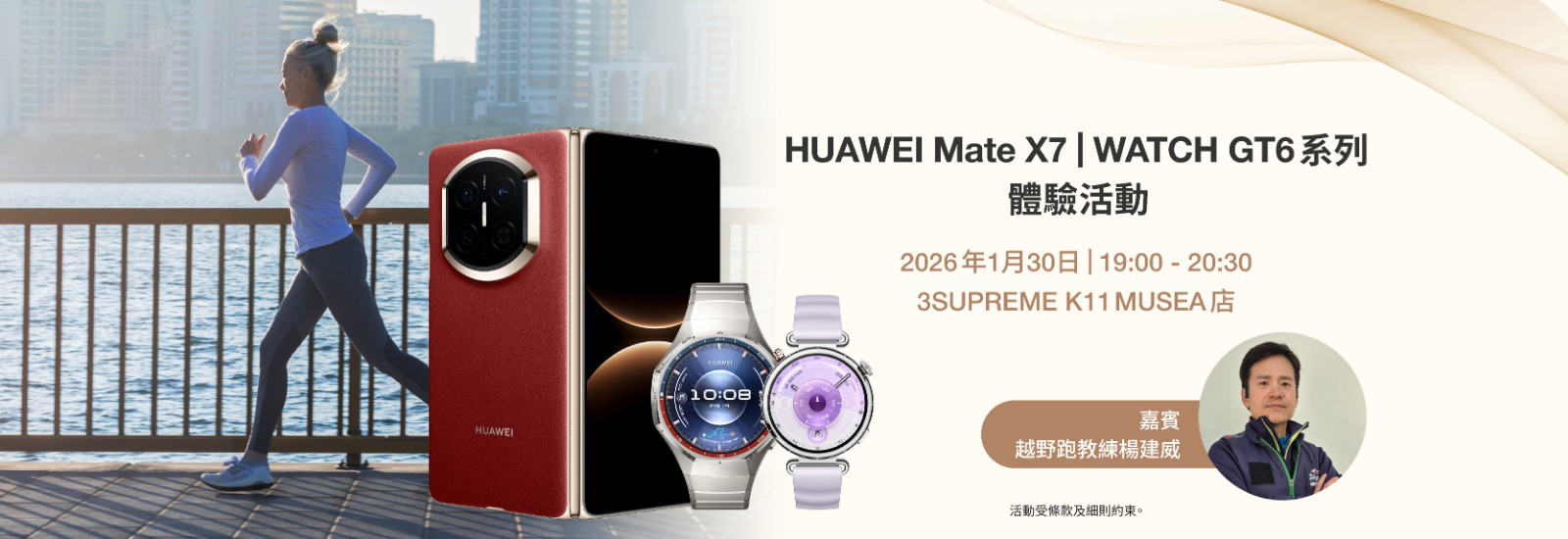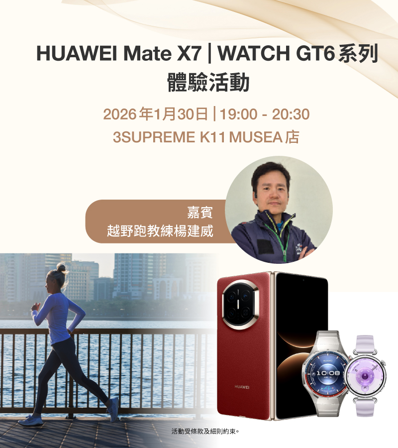 HUAWEI Mate X7纖薄強韌的摺疊設計,加上第二代紅楓原色鏡頭,將色彩忠實還原,令影像栩栩如生; 搭配HUAWEI WATCH GT6 系列,24小時全天侯相伴你的日常生活、運動與旅行,開啟智慧健康生活新體驗! 3SUPREME誠邀你出席專屬體驗活動,HUAWEI 專員將詳解新機及手錶各項創新功能,現場更提供實機試玩!我們特別邀請資深越野跑教練楊建威到場,分享實用長跑及上落斜技巧 ,示範如何透過智能手機與手錶實時掌握運動狀態,高效提升訓練表現! 歡迎攜同一位親友出席,出席者均可獲得HUAWEI藍牙耳機,更有機會獲得 HUAWEI WATCH GT6或 MatePad 11.5 2025(價值分別為$1,699及$1,899,名額共4個)! 活動詳情: 日期:2026年1月30日(星期五) 時間:19:00至20:30(18:45開始登記入場) 地點:3SUPREME K11 MUSEA店