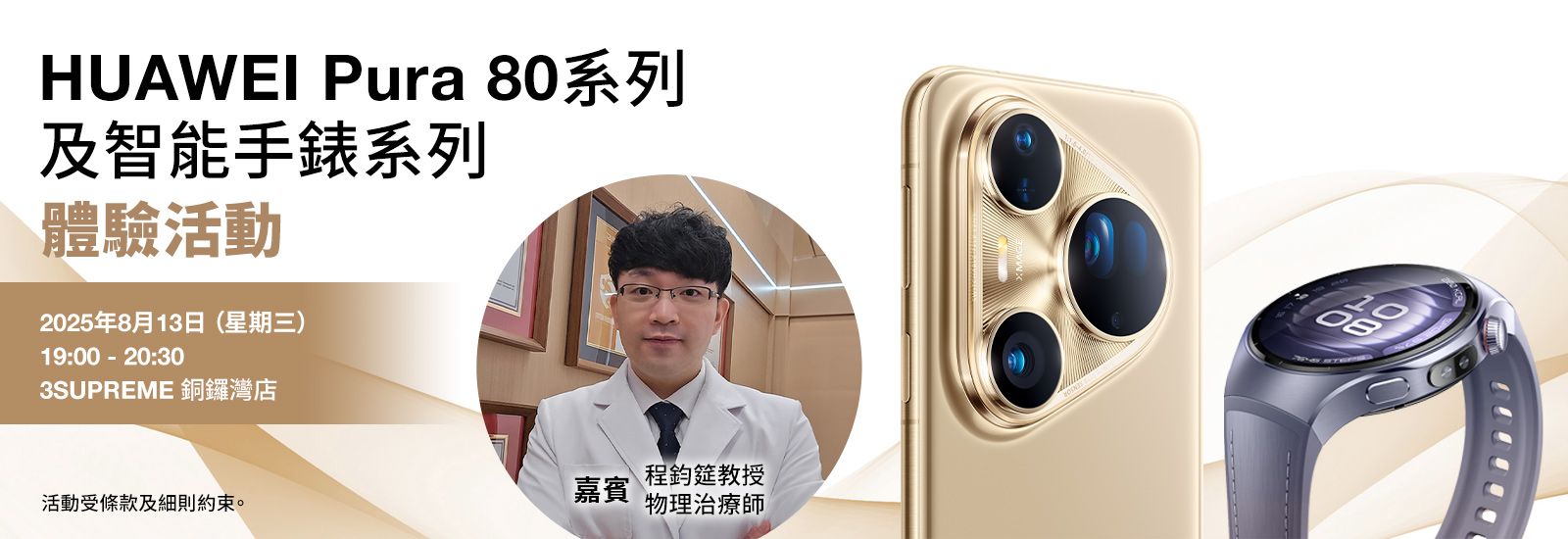 專為專業影像而設的最新旗艦HUAWEI Pura 80系列即將耀眼登場!Pura 80 Ultra配備了業界首創的雙長焦鏡頭,以及革新1吋超高動態主鏡頭,讓你輕鬆拍出「攝」人心弦的精彩作品!搭配HUAWEI 智能手錶系列,讓你隨時掌握全面健康數據,邁向健康生活! 3SUPREME誠邀你出席體驗活動,HUAWEI 專員將為你詳細介紹 Pura 80系列、WATCH D2及WATCH 5各項強大功能。我們更特別邀請物理治療師程鈞筵教授到場,與大家分享實用健康資訊,並示範如何有效透過智能裝置,輕鬆開創健康生活! 歡迎攜同一位親友出席活動。出席者除了可即場參與一對一痛症專科諮詢外*,更可免費獲贈肌肉骨骼超聲波圖像診斷^(價值$2,700)及精美禮物。此外,現場還有機會贏得 HUAWEI 平板電腦乙部(價值$1,688,名額10個)! 立即報名👉🏻 活動詳情: 日期:2025年8月13日(星期三) 時間:19:00至20:30(18:45開始登記入場) 地點:3SUPREME 銅鑼灣店