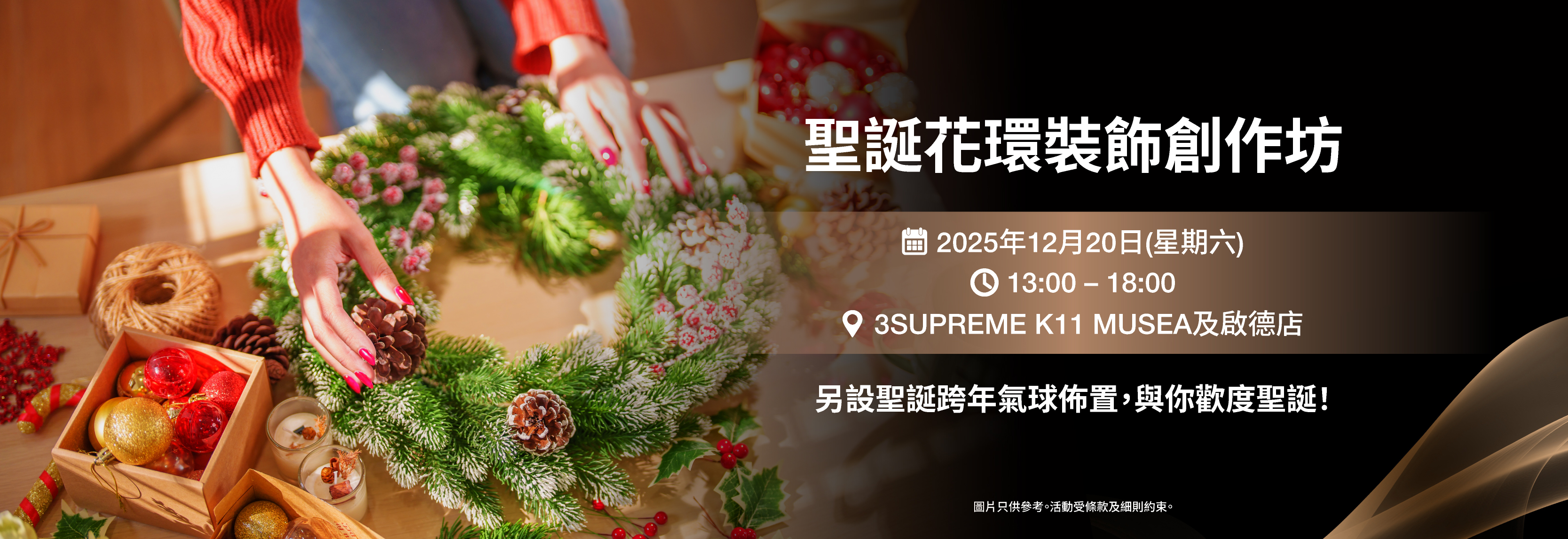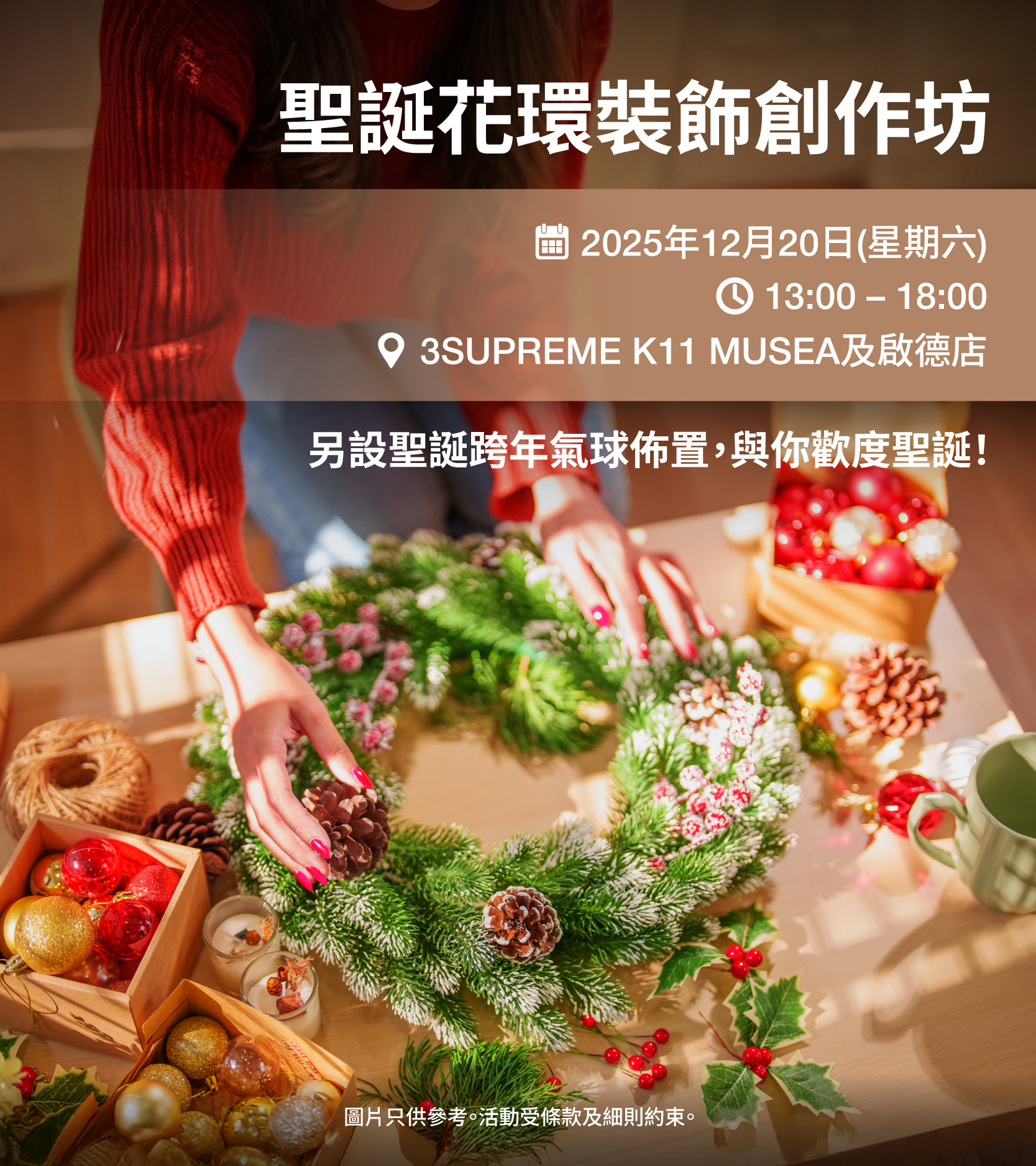 普天同慶佳節將至,3SUPREME呈獻聖誕限定活動。我們將於K11 MUSEA及啟德店舉行聖誕花環裝飾創作坊^,讓你以聖誕藤圈及繽紛裝飾親手製作專屬節日花環,為家中增添濃郁聖誕氣氛! 此外,我們更於中環、K11 MUSEA、啟德、荃灣及大圍門市特設聖誕及新年氣球裝置。立即約同親友前來打卡,歡度聖誕、喜迎2026新年! 活動詳情: 日期:2025年12月20日(星期六) 時間:13:00 – 18:00 地點:3SUPREME K11 MUSEA店及啟德店 費用:全免
