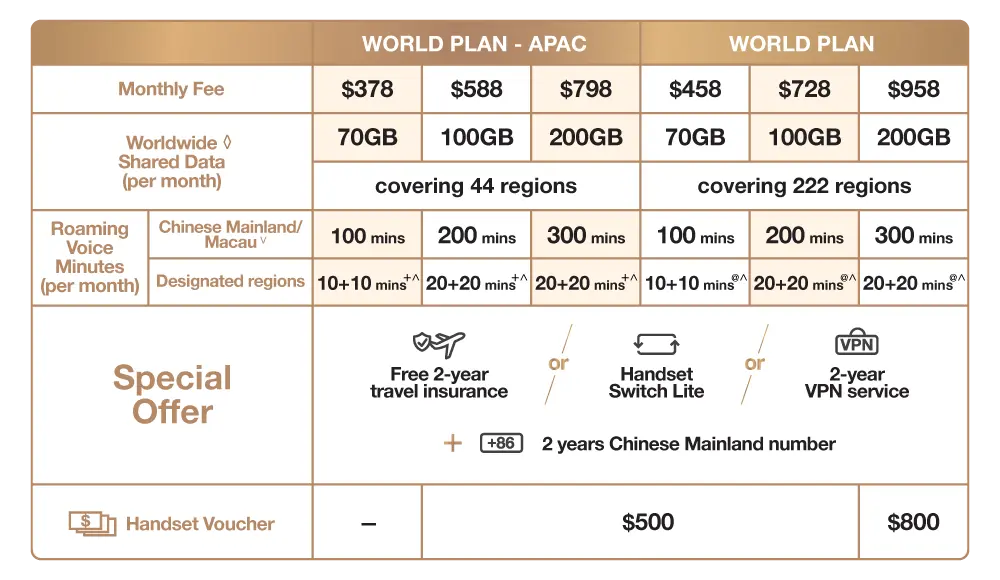 From now on, subscribe to a designated WORLD PLAN or 5G plan at our shop can enjoy below offers: |