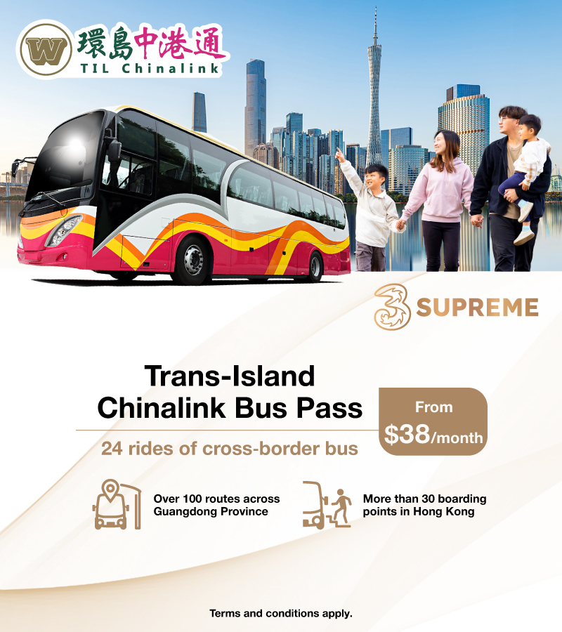 Q1. What is the “Trans-Island Chinalink Bus Pass”? The Trans-Island Chinalink Bus Pass is a value‑added service jointly launched by 3 Hong Kong and Trans-Islands Chinalink, offering 6‑, 12‑ and 24‑month plans. One designated one‑way cross‑border bus ticket 0‑dollar discount coupon will be issued each month for use when purchasing tickets, allowing travel on China–Hong Kong cross‑border buses at fares as low as 12% of the original price.