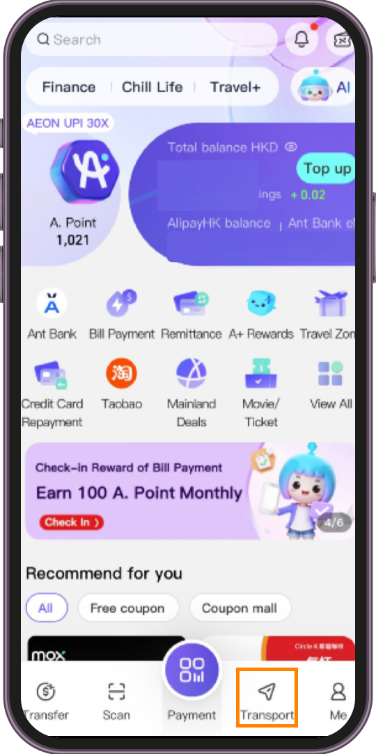 Open the AlipayHK App → Tap “Transport”