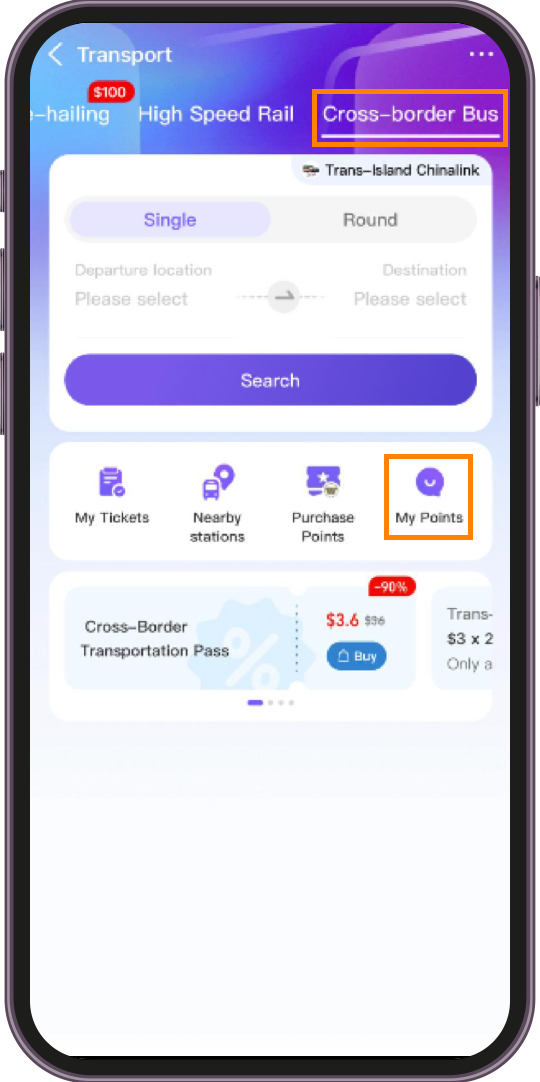 Tap “Cross-border Bus” → Tap “My point”