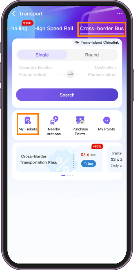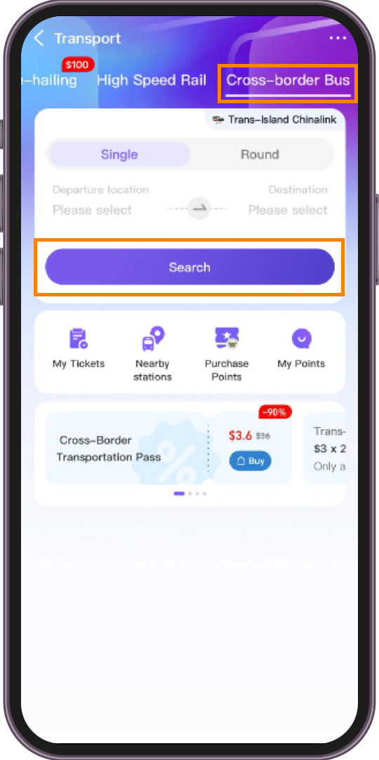 Tap “Transport” → Tap “Cross-border Bus” → Tap “Search” ![]() 2