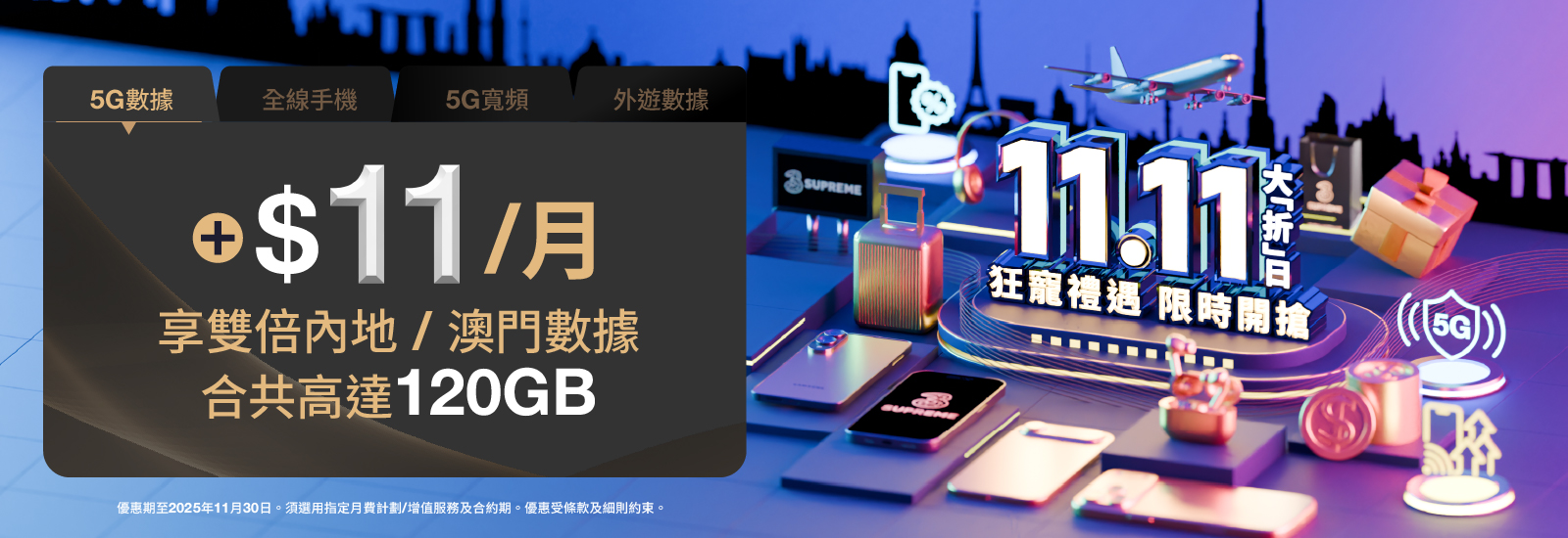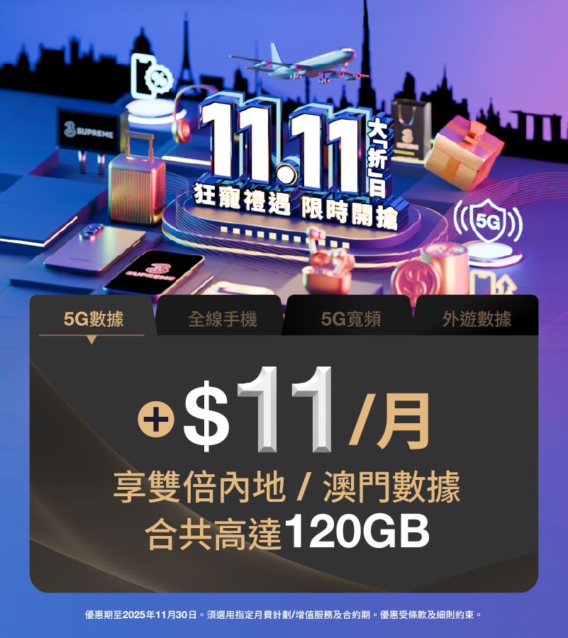 即日起至2025年11月30日上台指定5G月費計劃,加$11享
